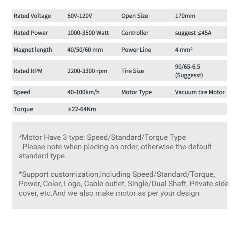 | Motor type: Vacuum Tire | Speed:40-100Km/h |